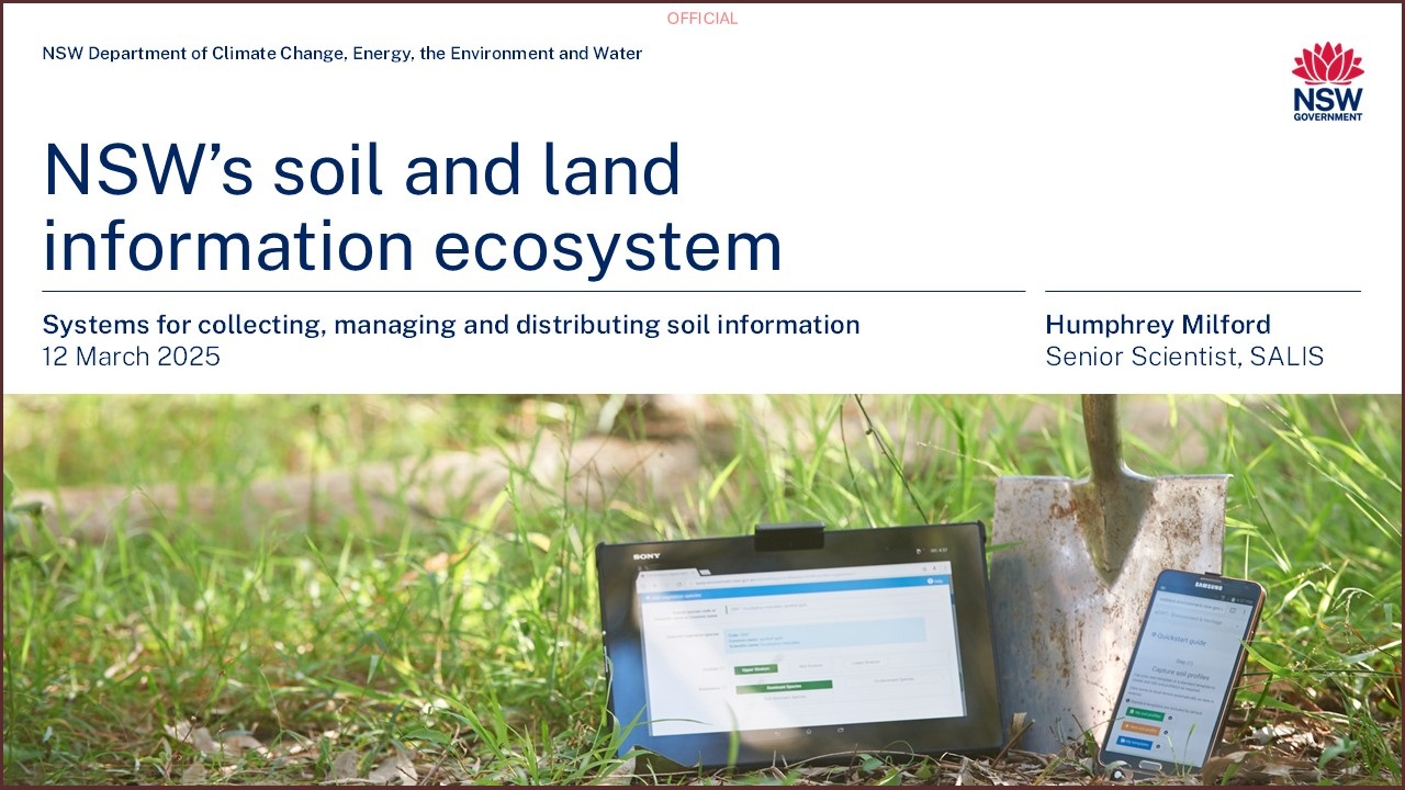 Humphrey Milford (New South Wales (NSW) Department of Climate Change, Energy, the Environment and Water) detailed NSW’s soil data systems, including data collection tools (EDIRT), corporate databases (SALIS), spatial viewers (eSPADE), and mobile apps (Soils Near Me). NSW soils data is openly accessible under Creative Commons licensing, with plans to enhance mobile data collection, cloud migration, and stakeholder engagement.