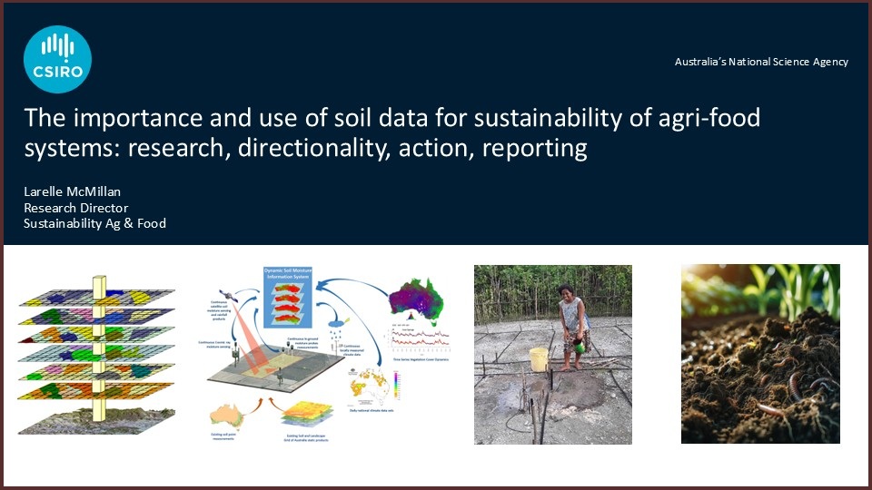 Larelle McMillan (CSIRO) highlighted the foundational role of soil in ecosystems and threats to soil, such as erosion and acidification. She described national and international initiatives like the National Soil Monitoring Plan and the Pacific Soil Partnership, emphasising collaboration, standardised methodologies, climate resilience, and integration with sustainability frameworks.