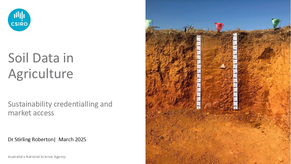 Stirling Robertson (CSIRO) emphasised soil data’s role in agriculture, sustainability credentialing, and benchmarking. He discussed challenges with global and national benchmarks, advocating for regionally specific metrics and long-term monitoring. ANSIS’s work in federating datasets for soil organic carbon, pH, and electrical conductivity was presented, along with tools for benchmarking soil health at farm levels.